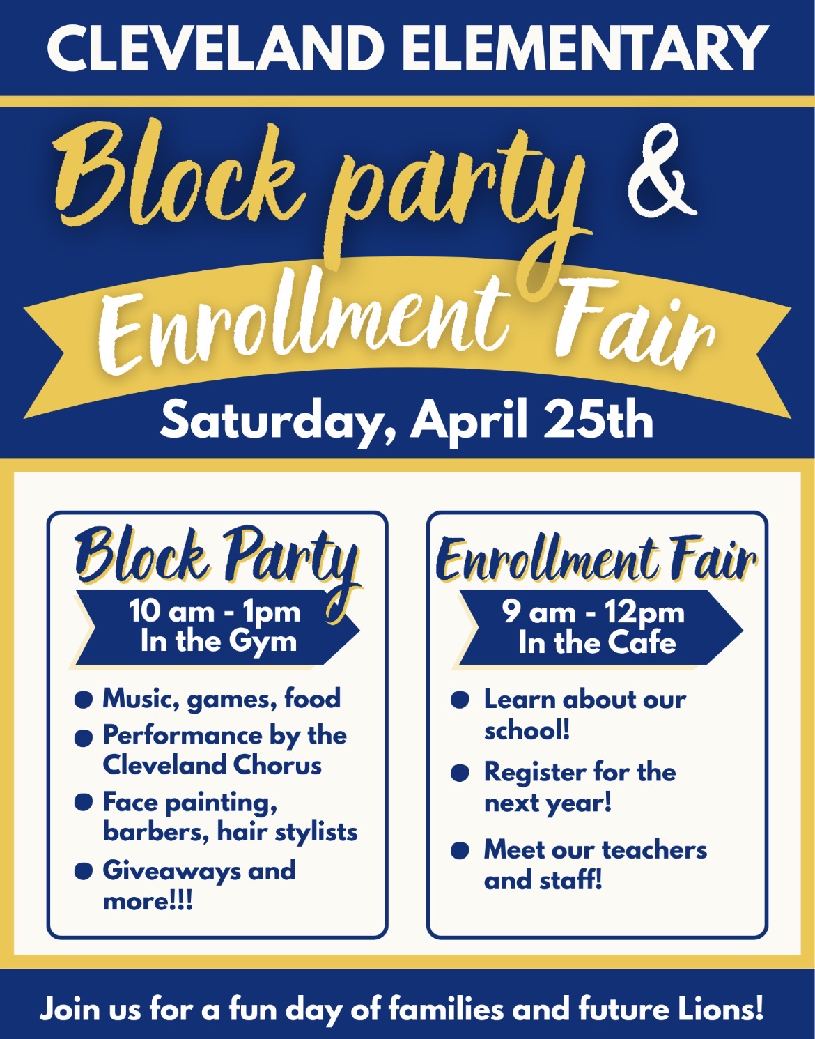 Cleveland Elementary School's annual block party and enrollment fair to share info with parents and community members.